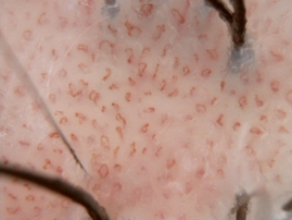 头皮银屑病可见亮红色背景,镜下见均匀一致分布的点状血管、小球状血管、环状血管、发夹样血管,伴白色鳞屑。