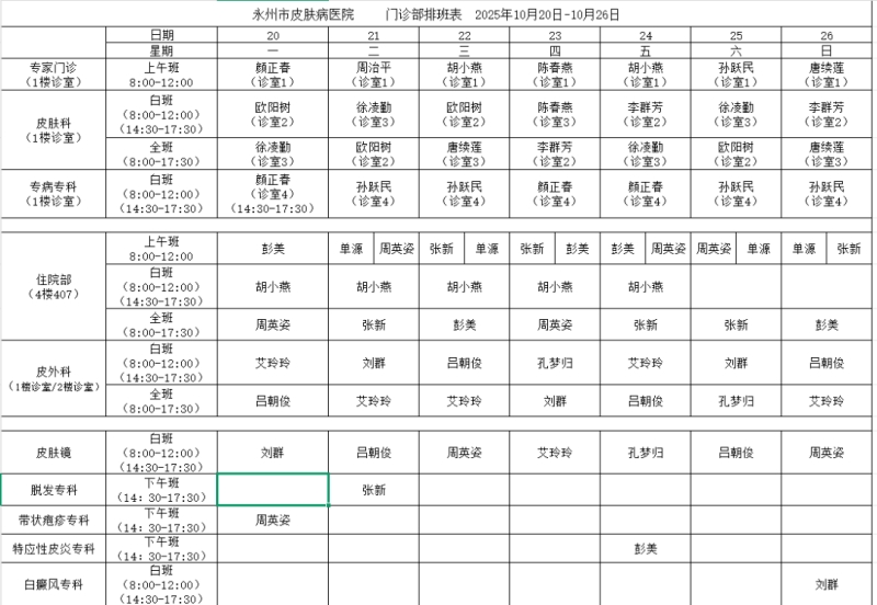 门诊:上午班:8:00-12:00 白班8:00-12:00 14:30-17:30