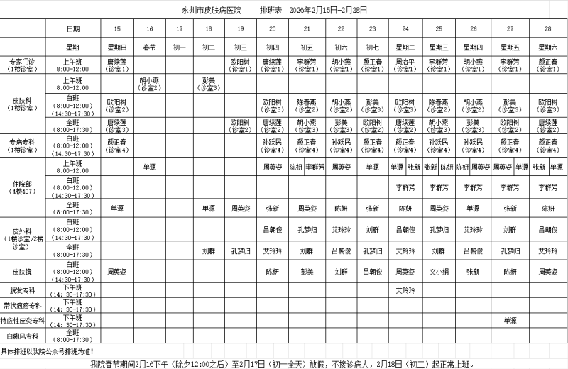 新春佳节将至,根据国务院办公厅节假日安排的通知,结合医院实际情况,永州市皮肤病医院春节期间具体门诊工作安排如下: