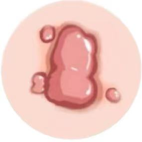 3、瘢痕疙瘩:瘢痕疙瘩是过度侵略性愈合过程的结果,常常超过原皮肤的损伤范围。主要表现:病变范围超过原伤口,持续生长,表面质硬韧,颜色发红,可能是结节状、条索状或片状肿块。
