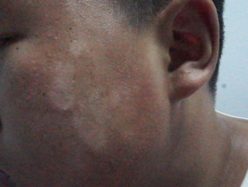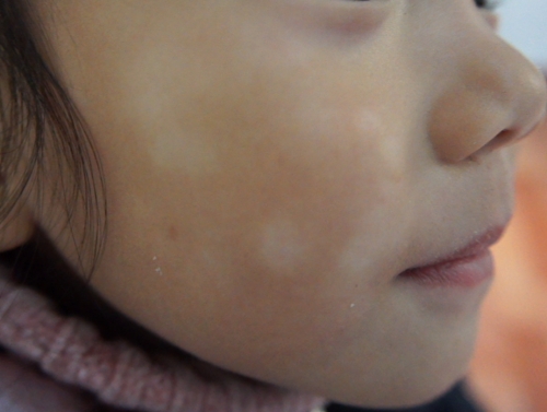 这些白斑孩子通常没有特殊感觉,只是肤色看起来不太均匀,通常为指甲盖大小的白色斑片,和周围皮肤的边界不太清晰,上还有些细碎鳞屑,所以被称为白色糠疹,又叫单纯糠疹,民间常被称为“虫斑”。